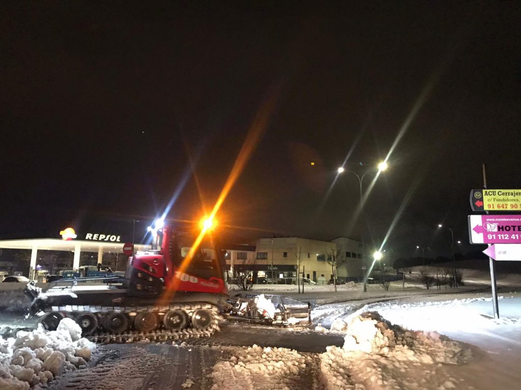 Están siendo apoyados por máquinas quitanieves que han cedido Madrid Snow Zone e Intu Xanadu, que durante esta madrugada han trabajado para retirar la nieve acumulada, de más de medio metro en algunos puntos.