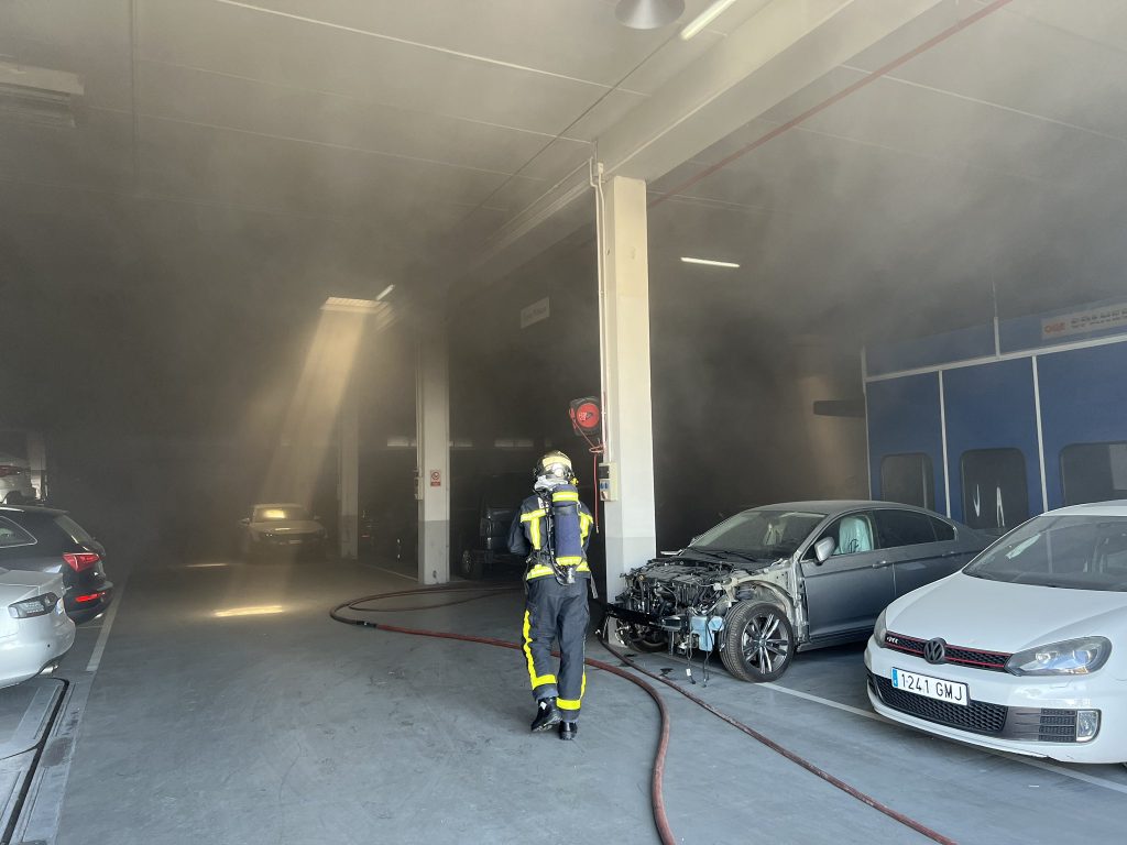 Hasta el lugar han acudido cinco dotaciones de Bomberos de la Comunidad, que han logrado confinar el incendio en la cabina y evitar la propagación a la tres cabinas contiguas, al resto de la estructura y a los vehículos que había en la nave.