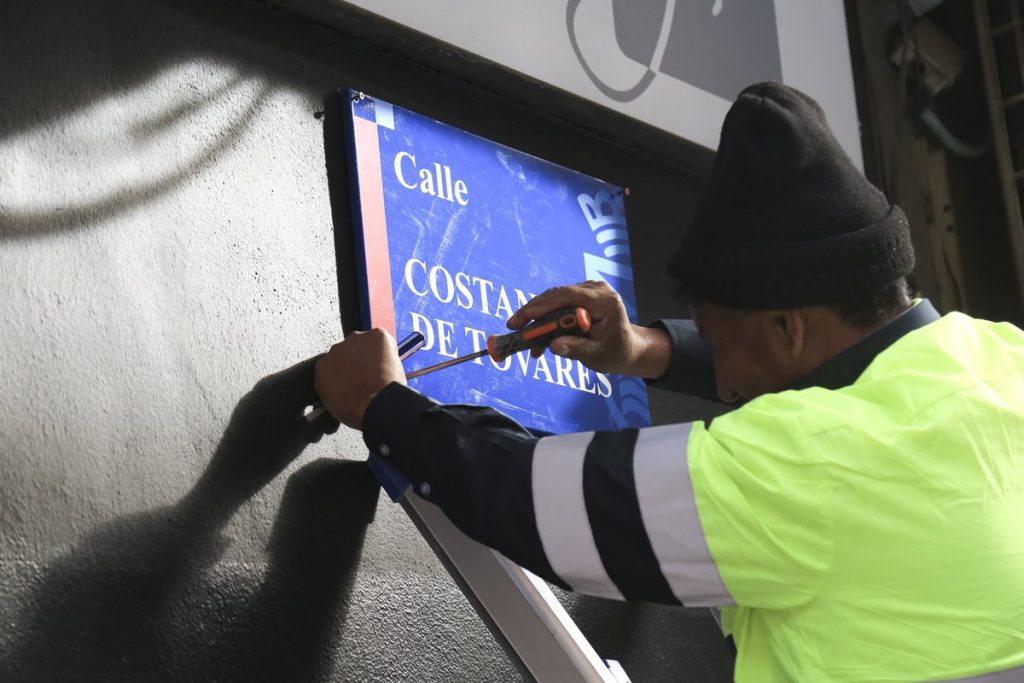Operarios municipales han llevado a cabo la retirada de las placas de las calles con denominaciones de militares vinculados con la sublevación de la Guerra Civil y las han cambiados por sus nuevos nombres, tal como se aprobó en el Pleno del pasado mes de enero tras el dictamen de la comisión de Memoria Histórica.