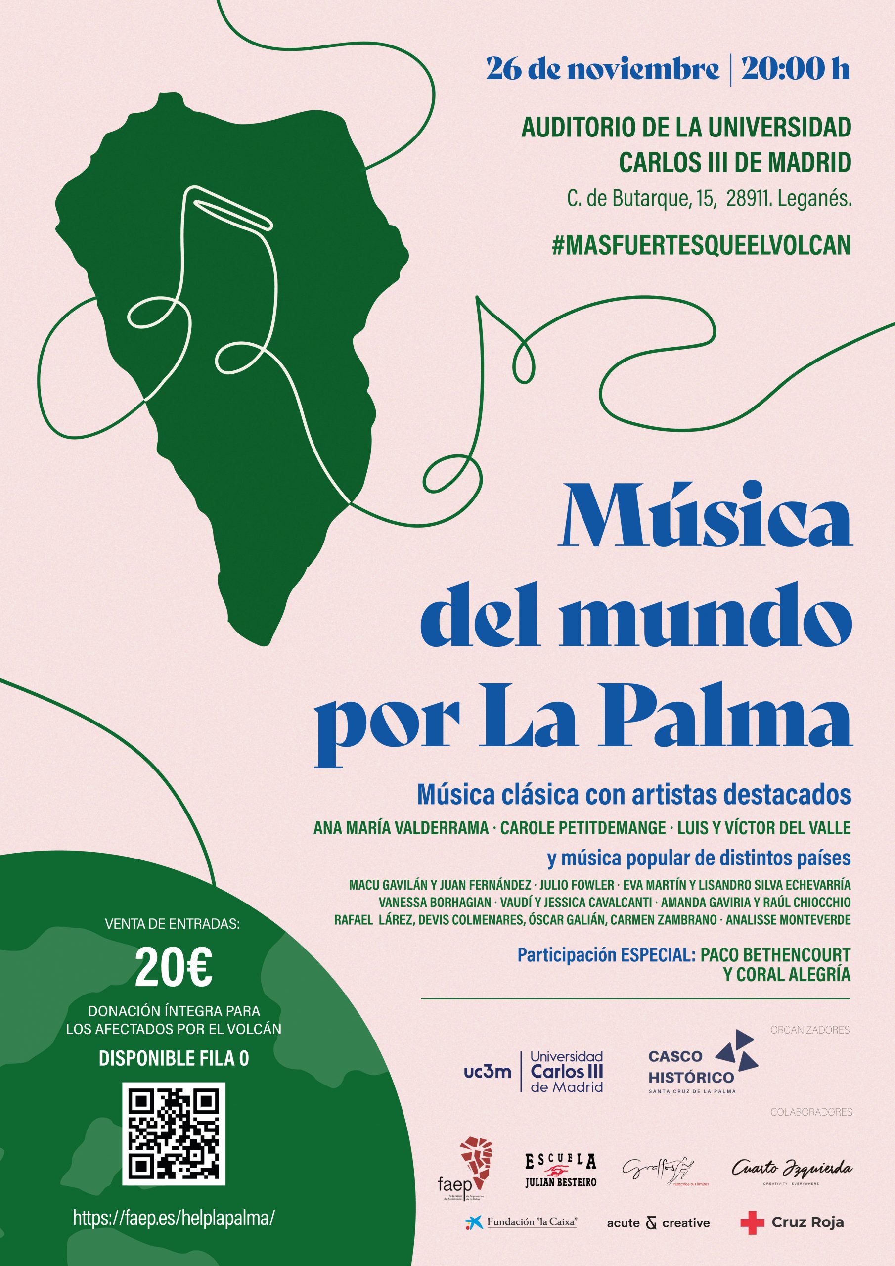 El Festival está organizado por la propia UC3M y Casco Histórico Santa Cruz de La Palma, con la colaboración de la Fundación La Caixa, FAEP, Cruz Roja, Actute & Creative. Las entradas, ya a la venta, tienen un precio de 20 euros y lo recaudado irá íntegramente a los habitantes de La Palma.