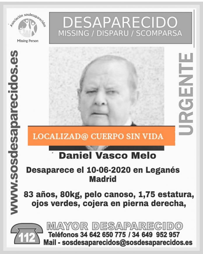 Triste noticia en Leganés. La Asociación SOS Desaparecido ha informado de que ha aparecido el cuerpo sin vida de Daniel Vasco Melo, un hombre de 83 años al que se buscaba desde el pasado 10 de junio. Fue visto por última vez en Leganés.