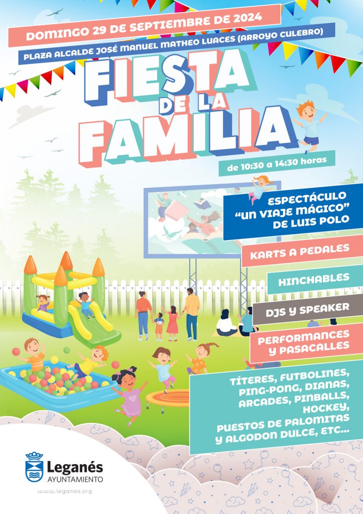 El Ayuntamiento de Leganés organizará este domingo 29 de septiembre ‘La Fiesta de la Familia’ en el barrio de Arroyo Culebro. A partir de las 10:30 y hasta las 14:30 horas, la Plaza del Alcalde José Manuel Matheo Luaces, epicentro del barrio, se convertirá en un gran parque infantil con numerosas atracciones para el disfrute de mayores y pequeños como hinchables, ludoteca, pasacalles, futbolines, karts, máquinas Arcade, títeres, animaciones, magia, performances y música.