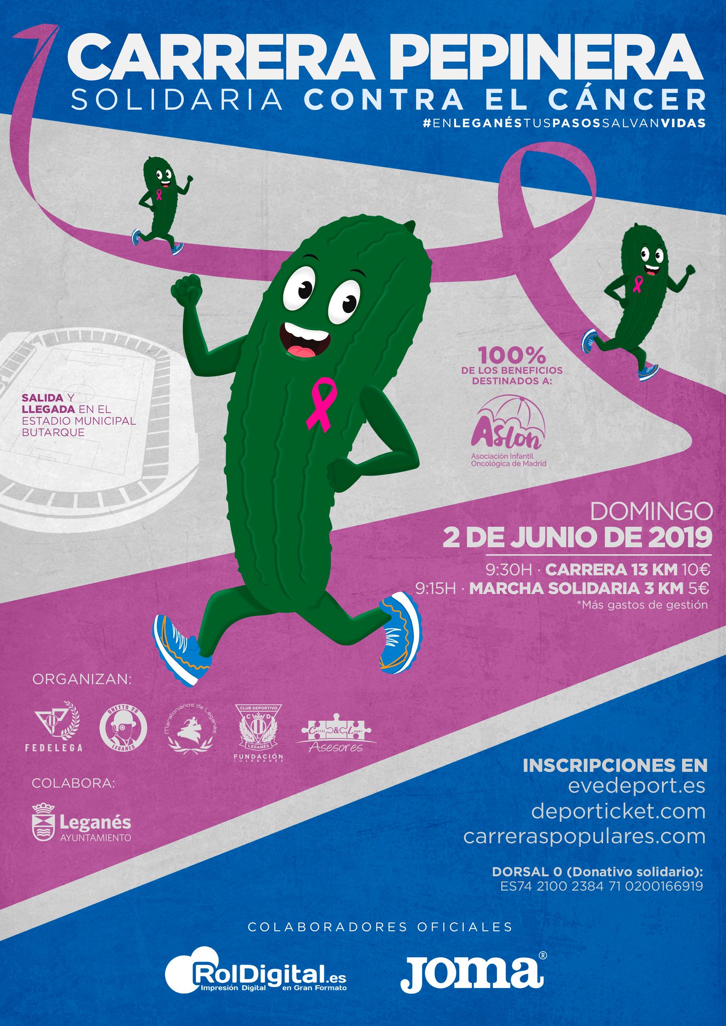 La I Carrera Pepinera verá la luz el próximo 2 de junio gracias a la implicación de CD Leganés, Federación de Peñas, Guetto 28, Maratonianos Leganés, Asesoría Cortes&Luque y Ayuntamiento. Habrá dos pruebas, una carrera de 13 kilómetros (10 euros) y una marcha solidaria de 3 kilómetros (5 euros), en ambos casos con salida y llegada en el estadio de Butarque.