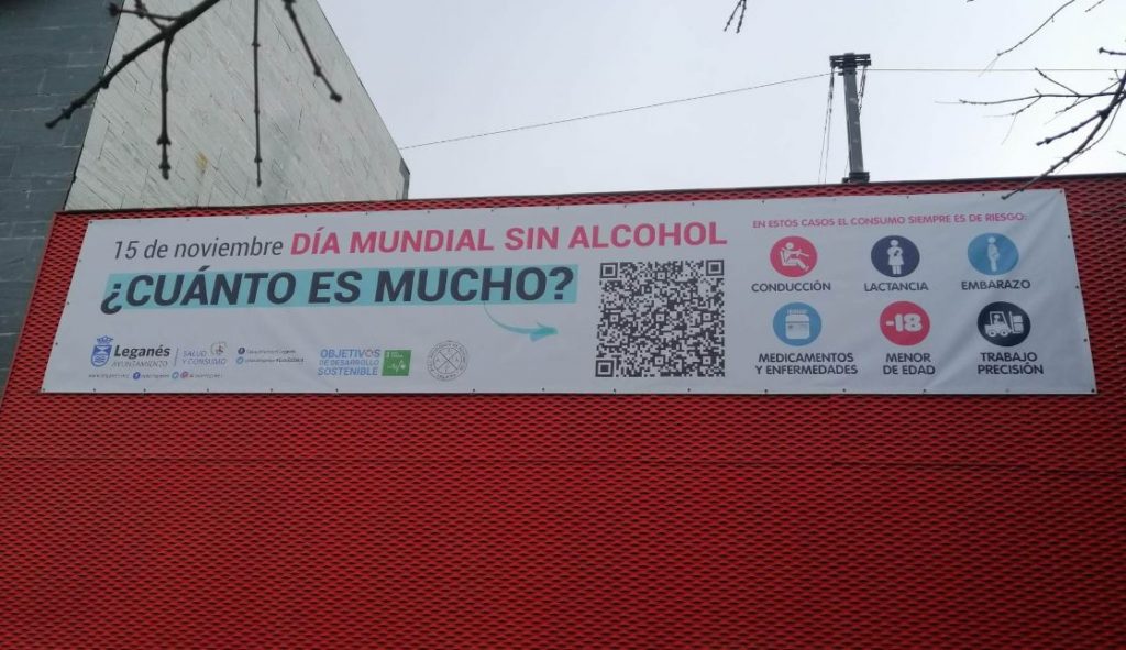 En las tres estaciones de Renfe de Leganés se han instalado 3 grandes lonas que servirán para acercar información a la ciudadanía. A través de un código QR se puede acceder fácilmente al espacio habilitado en la web municipal con los peligros derivados del consumo de alcohol. En este espacio web se puede conocer a través de un test si se realiza un consumo elevado de alcohol y cuenta con una guía de recursos con materiales propios del Ayuntamiento de Leganés, del Ministerio de Sanidad, de asociaciones locales y específicos para la juventud.
