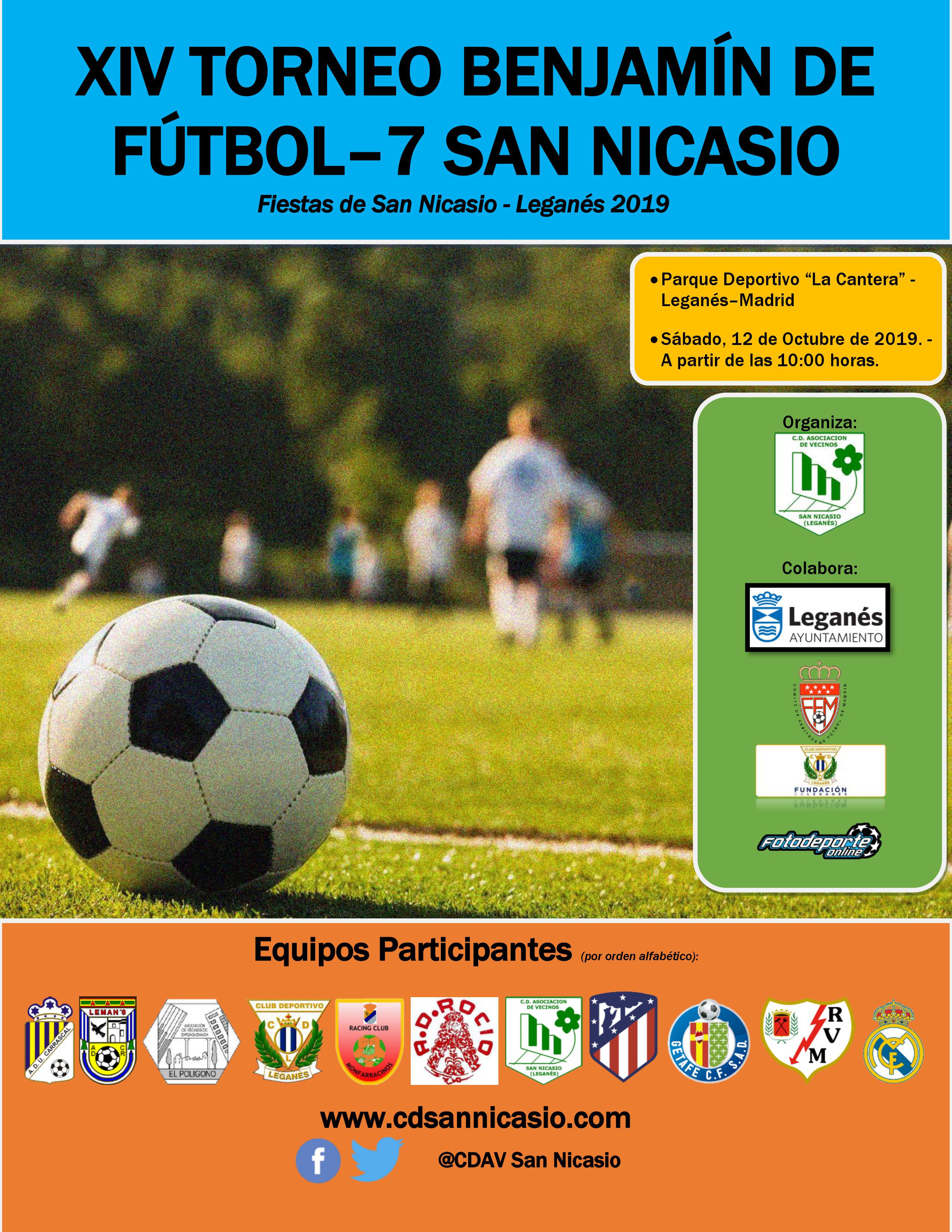 Los partidos darán comienzo a partir de las 10.00 horas y la organización del evento correrá un año más a cargo del CD Asociación de Vecinos San Nicasio con la colaboración del Ayuntamiento de Leganés, la Fundación del CD Leganés y el Comité de Árbitros de Fútbol de Madrid.