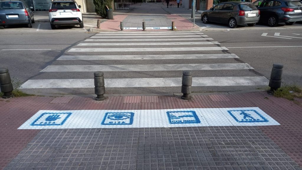 En estos pasos de cebra se pintan cuatro pictogramas con los mensajes ‘para’, ‘mira’, ‘coche parado’ y ‘cruza’, algo que sirve para facilitar la inclusión de las personas con Trastorno el Espectro Autista, pero también de los vecinos y vecinas con discapacidad intelectual, personas mayores, niños y niñas.