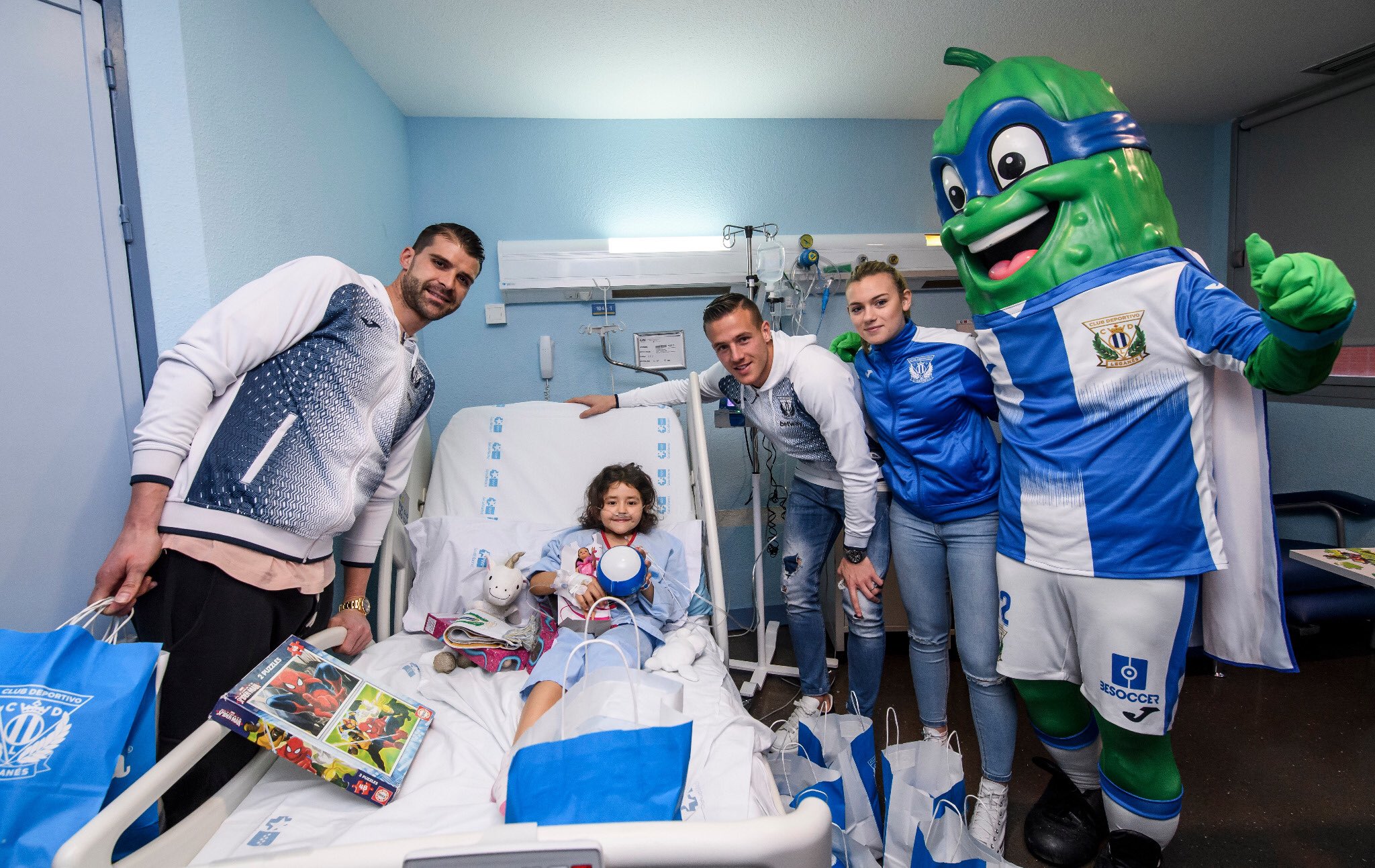 Tal y como viene siendo tradición en los días previos a la llegada de los Reyes Magos, una representación del CD Leganés se ha trasladado este lunes hasta el Hospital Universitario Severo Ochoa para repartir una serie de regalos entre los pacientes ingresados en la unidad de pediatría y en una planta de hospitalización de adultos.