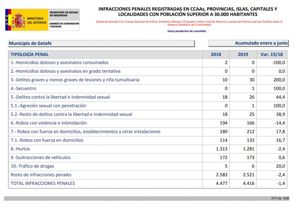 La delincuencia se reduce ligeramente en Getafe entre enero y junio de 2019. Concretamente, las infracciones penales caen un 1,4%, pasando de 4.477 cometidas en el mismo periodo de 2018, frente a las 4.416 en lo que llevamos de año, según datos del Ministerio del Interior.