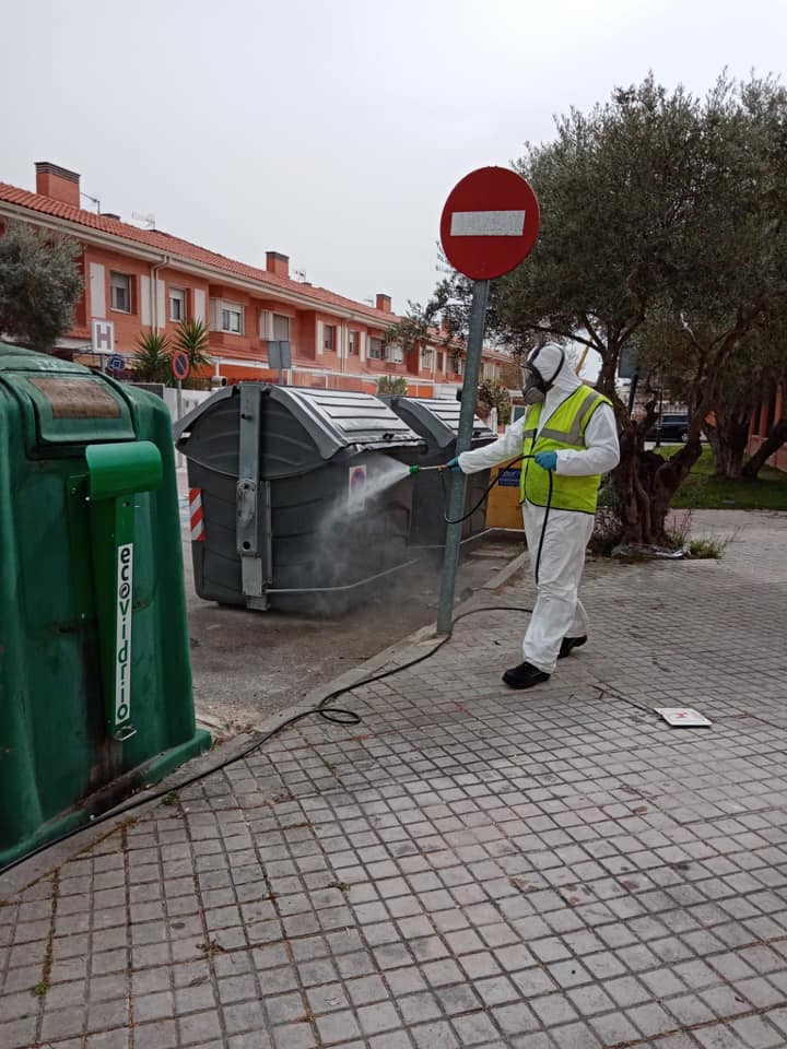 Trabajadores de limpieza de Griñón han empezado a desinfectar mobiliario urbano, contenedores, centros municipales, zonas de afluencia, parques y calles para evitar zonas de contagio de coronavirus.