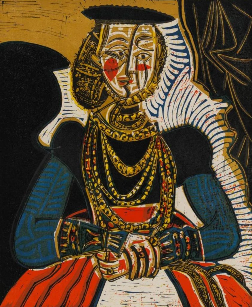 La primera obra de esta serie es del año 1958. Se trata del retrato de una dama a partir de una pintura de Cranach el Joven. Esta pieza —la única que respetará la técnica tradicional— consta de seis planchas de linóleo grabadas por los seis colores que el impresor tira sucesivamente en la misma hoja de papel. A lo largo de su extensa trayectoria, Picasso nunca dejó de experimentar e innovar a través de distintos medios artísticos y, en los años cincuenta, el linograbado se convirtió en una de sus técnicas favoritas.