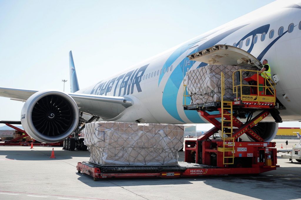 El avión que ha llegado este viernes a Barajas es un Boeing 777, cargado con 30 toneladas de material sanitario (entre ellos, las mascarillas). Viene procedente de Shanghai (China), como los seis anteriores del último mes, aunque en este caso ha hecho escalada en El Cairo (Egipto). Se espera que a lo largo del fin de semana y principios de la que viene lleguen otros tres vuelos, también de China, con los que se alcanzarán los 7 primeros millones de mascarillas.