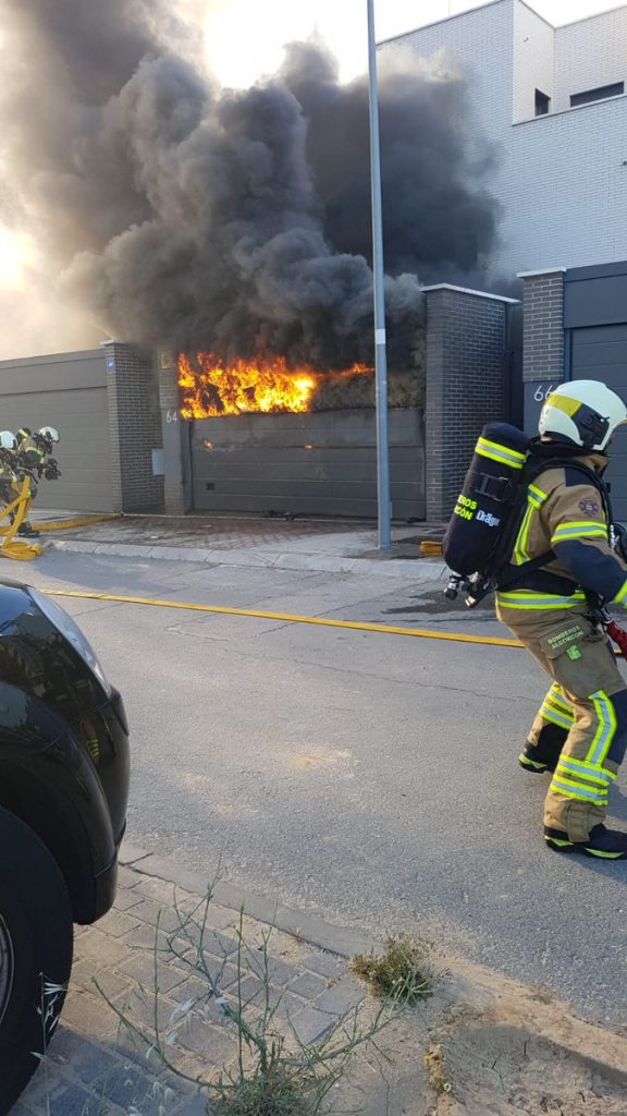 Los bomberos de Alcorcón apagan este domingo un espectacular incendio en el garaje de una vivienda unifamiliar privada ubicada en la calle Pablo Picasso. «La estancia del garaje sufre daños materiales, el resto del edificio sin afección», informaban los profesionales en su canal de Twitter.