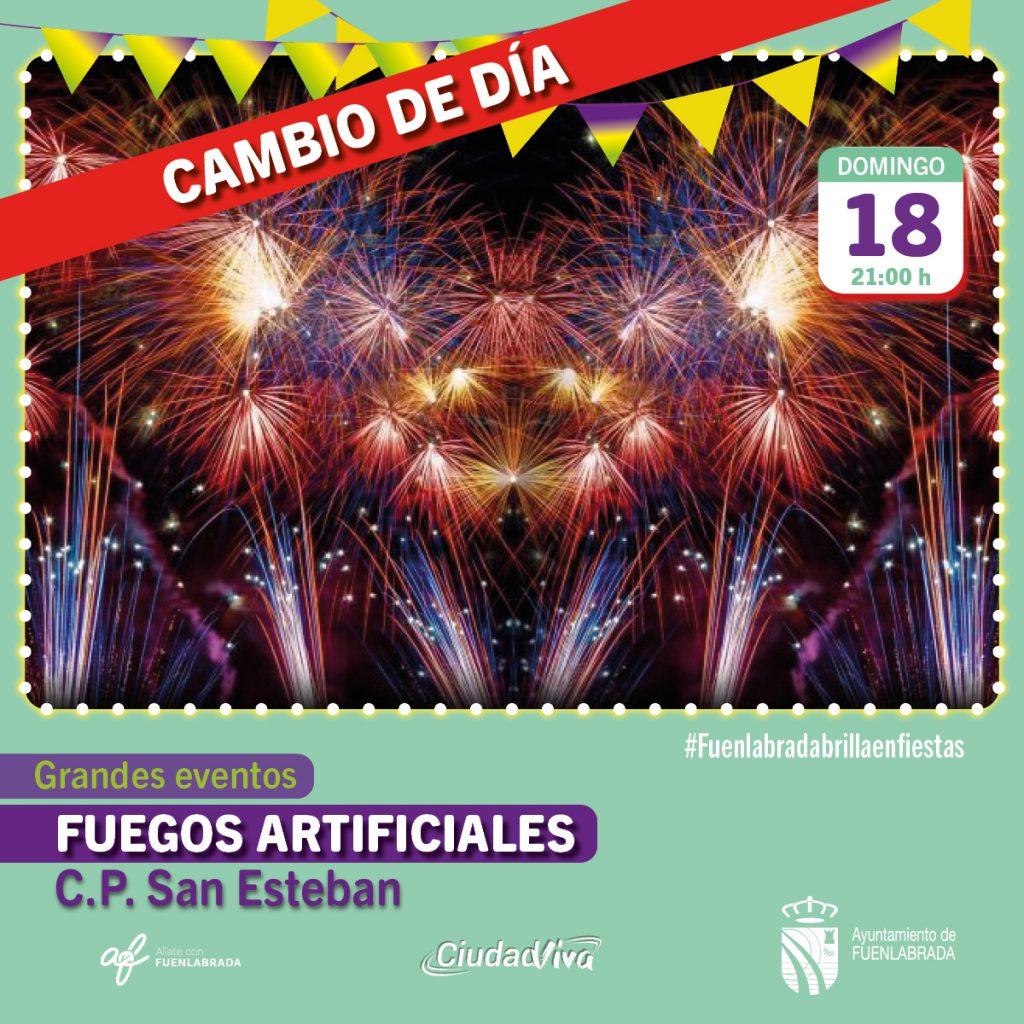 El Ayuntamiento de Fuenlabrada ha decidido aplazar los fuegos artificiales al domingo 18 de septiembre. Estaban previstos a las 00.00 horas del miércoles, 14 de septiembre, pero la previsión de lluvia ha hecho que se retrasen al fin de semana.