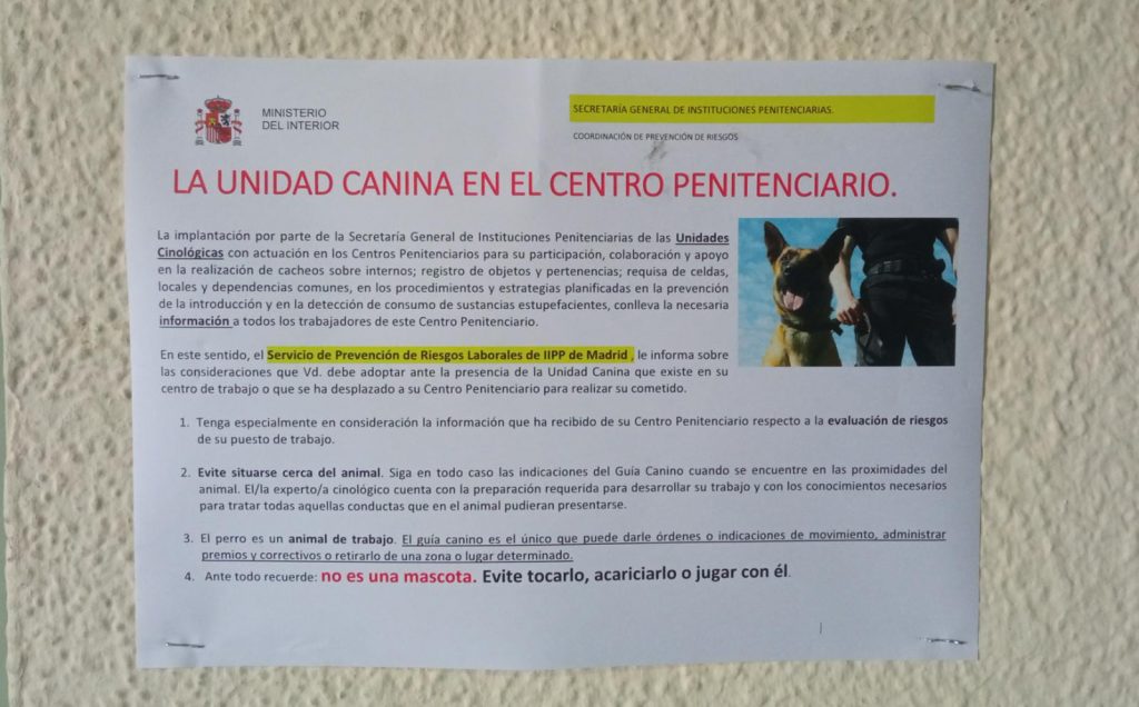Las unidades caninas fueron creadas en 2018 como un proyecto piloto en la cárcel de Burgos. Su objetivo es prevenir y evitar la introducción y el consumo de droga en las prisiones. Hasta ahora existían unidades caninas en la cárceles de Albolote, Algeciras, Córdoba, Huelva, Madrid III (Valdemoro), Málaga I, Málaga II, Mallorca, Puerto III y Sevilla II.