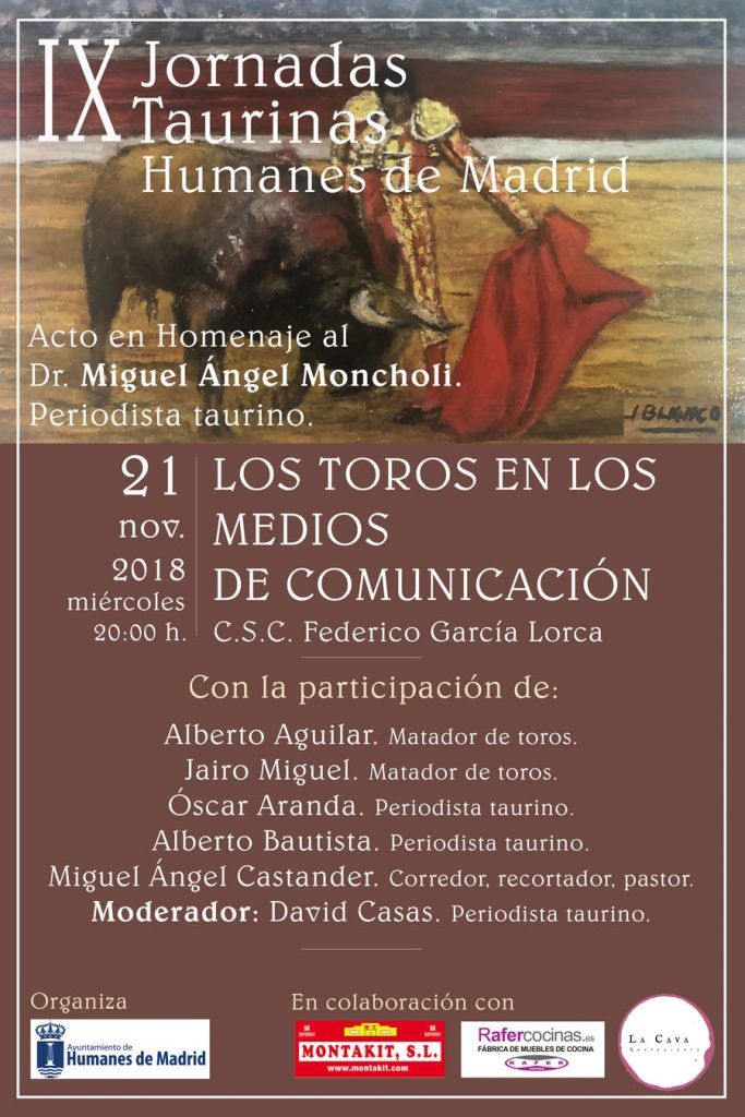 El Ayuntamiento de Humanes de Madrid, en colaboración con Montakit, Rafer Cocinas y Restaurante La Cava, organiza un año más las IX Jornadas Taurinas de Humanes de Madrid. Y en esta edición, el tema central será Los toros en los medios de comunicación, rindiéndose homenaje, además, al periodista taurino Miguel Ángel Moncholi.