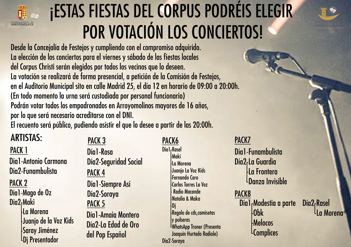 Desde la Concejalía de Festejos de Arroyomolinos se ofrecen una serie de packs con diferentes artistas para que los arroyomolinenses voten a sus favoritos. En estos packs se encuentran grupos como Funambulista, Seguridad Social, Soraya, Amaia Montero, Mago de Oz, Antonio Carmona, Maki, Rasel, Melocos o Danza Invisible, entre otros.