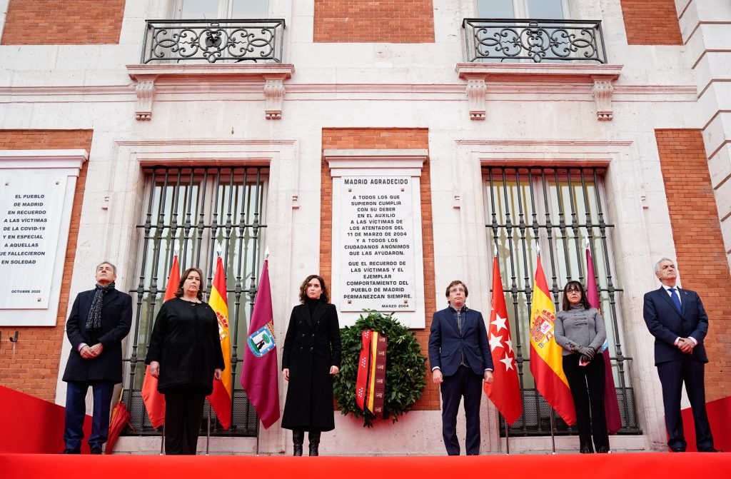 La presidenta de la Comunidad de Madrid, Isabel Díaz Ayuso, y el alcalde de Madrid, José Luis Martínez-Almeida, han depositado este viernes una corona de laurel ante la placa en la Real Casa de Correos, que recuerda a las víctimas de los atentados del 11 de marzo de 2004, así como a los servicios de emergencias y ciudadanos que las auxiliaron. La corona luce las banderas de España, la Comunidad de Madrid y la ciudad de Madrid.