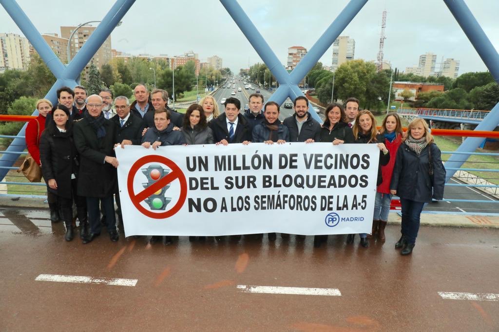 Con un cartel con el lema ‘Un millón de vecinos del sur bloqueados no a los semáforos de la A5’, la vicesecretaria de Comunicación del PP de Madrid, Isabel Díaz Ayuso; el vicesecretario Territorial, Antonio González Terol; el portavoz municipal del PP en el Ayuntamiento de Madrid, José Luis Martínez Almeida y el alcalde de Alcorcón, David Pérez, junto a otros portavoces ‘populares’ de Fuenlabrada, Getafe, Leganés y Arroyomolinos han denunciado que esta medida supone una «frontera» para el millón de ciudadanos que se verán afectados