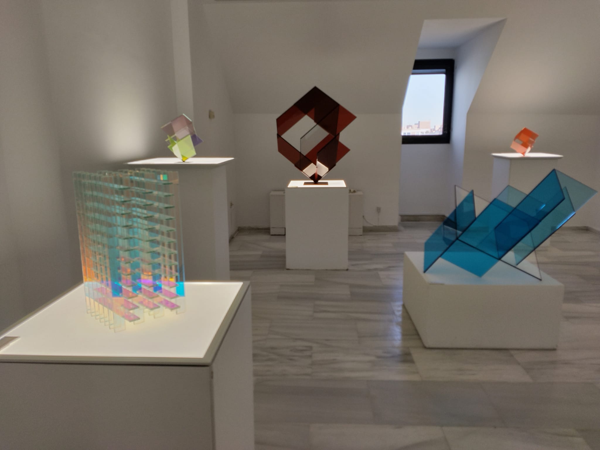 Y para completar el recorrido nos encontramos con ‘Symmetrias neoplatónicas 2021’, una colección de 8 esculturas de mediano y gran tamaño realizadas con vidrio plano, láminas acrílicas translucidas de color y vidrio laminar de color.