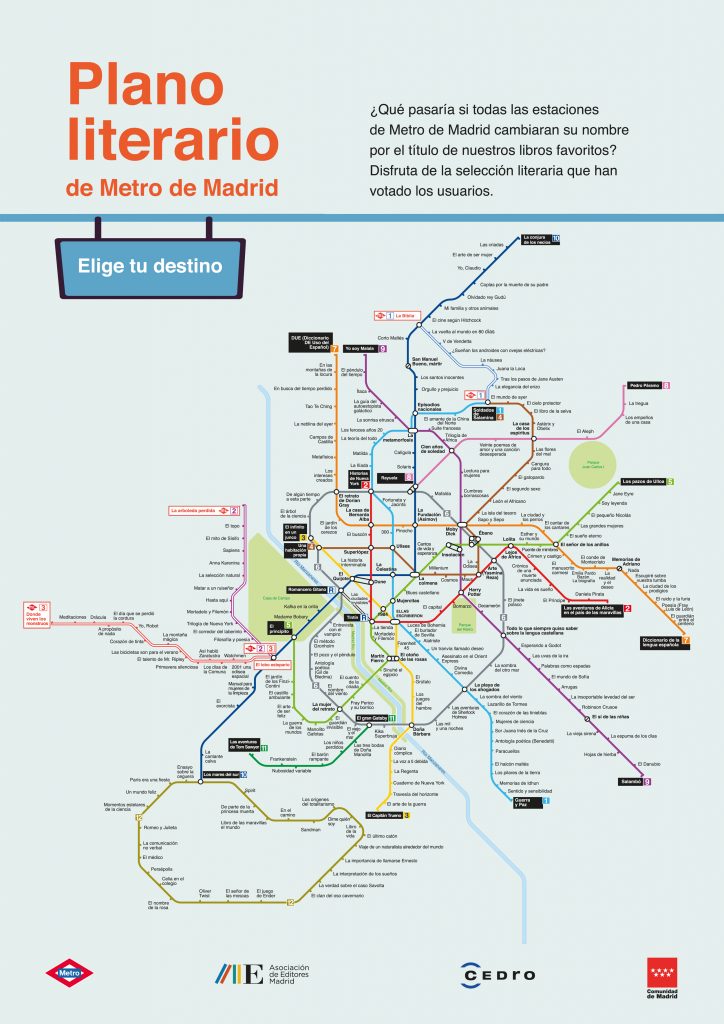 ‘Mi familia y otros animales’, ‘Los niños perdidos’, ‘El señor de las moscas’, ‘El juego de Ender’, ‘La verdad sobre el caso Savolta’, ‘Frankenstein’, ‘Orgullo y Prejuicio’, ‘Fortunata y Jacinta’, ‘La sombra del viento’, ‘Paracuellos’, ‘Fray Perico y su borrico’, ‘Las uvas de la ira’ o ‘Matar un ruiseñor’, son solo algunos de los títulos literarios con los que Metro de Madrid ha rebautizado de forma simbólica sus estaciones.