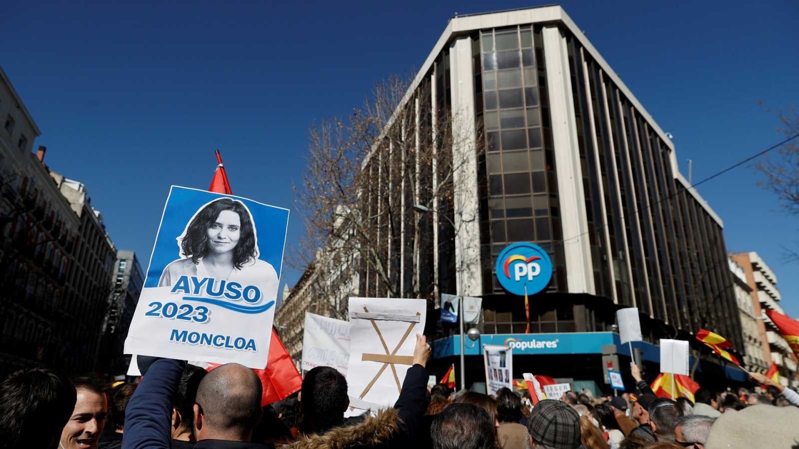 La concentración se ha producido después de que la Dirección nacional del PP anunciara que iba a cerrar el expediente informativo abierto a Ayuso, que compareció ante la opinión pública dando explicaciones de los contratos sanitarios, durante la pandemia.