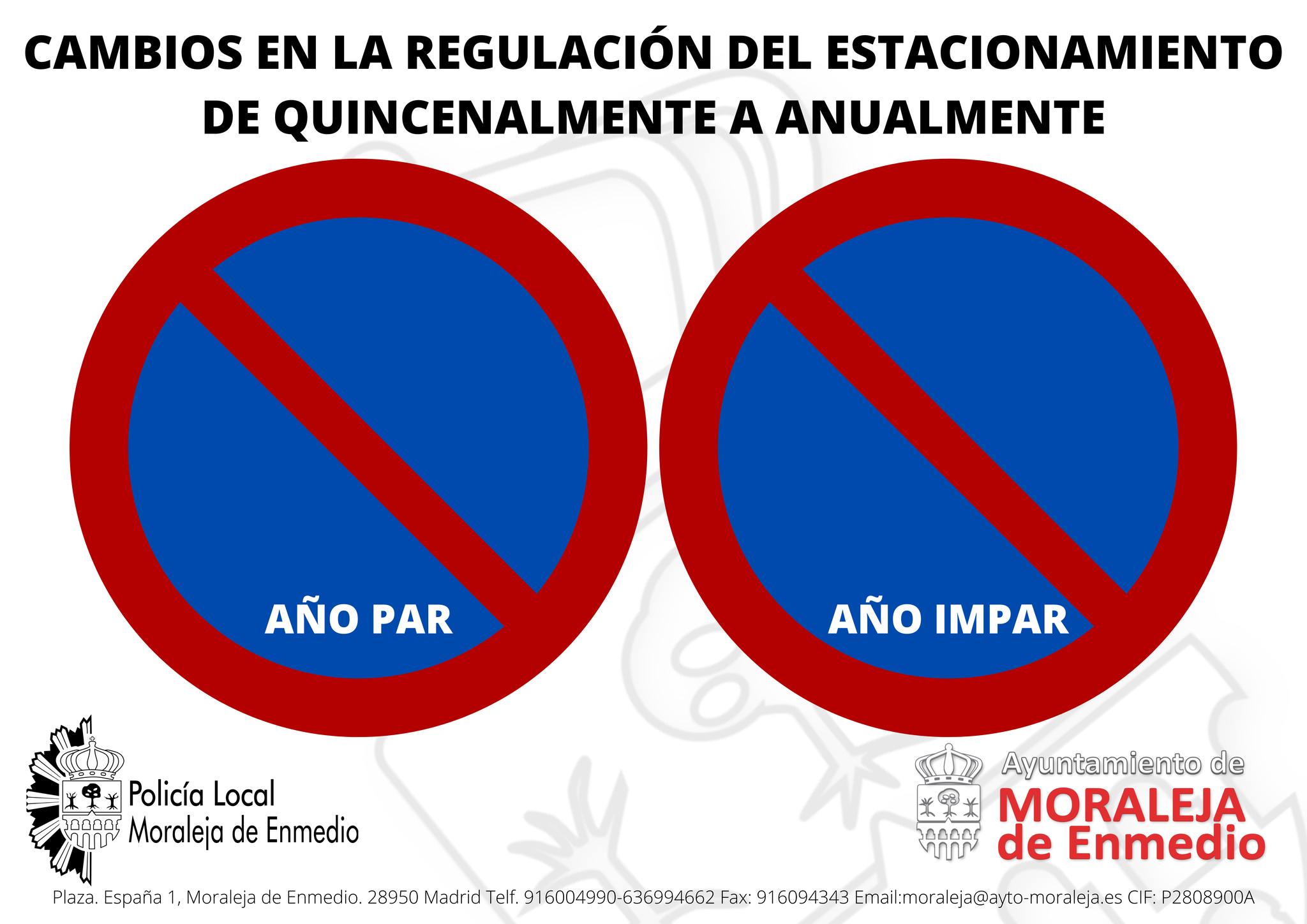 El Ayuntamiento de Moraleja de Enmedio está acometiendo el cambio de regulación del estacionamiento en varias calles de la localidad. Así, las que tenían un estacionamiento regulado quincenalmente, pasarán a tener el estacionamiento regulado anualmente, tanto par como impar.