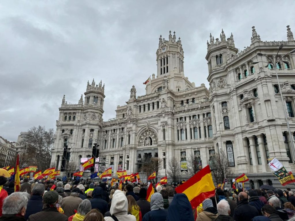 Miles de personas, 15.000 según datos de la Delegación del Gobierno y en torno a 400.000 según los manifestantes, se han concentrado este sábado en la plaza de Cibeles, pese a la amenaza de lluvia a lo largo de toda la mañana, para protestar contra la amnistía a los implicados en el ‘procés’ y exigir la dimisión del presidente del Gobierno, Pedro Sánchez.