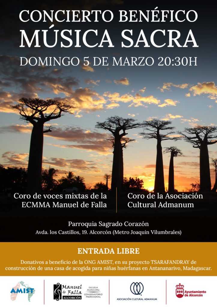 Así este domingo, 5 de marzo, a las 20.30 horas en la Parroquia Sagrado Corazón, el Coro de Voces Mixtas de la Escuela Municipal y Conservatorio Profesional de Música ‘Manuel de Falla’, junto al Coro de la Asociación Admanum, brindan un concierto solidario a beneficio de la ONG AMIST, para continuar con su proyecto ‘TSARAFANDRAY’.