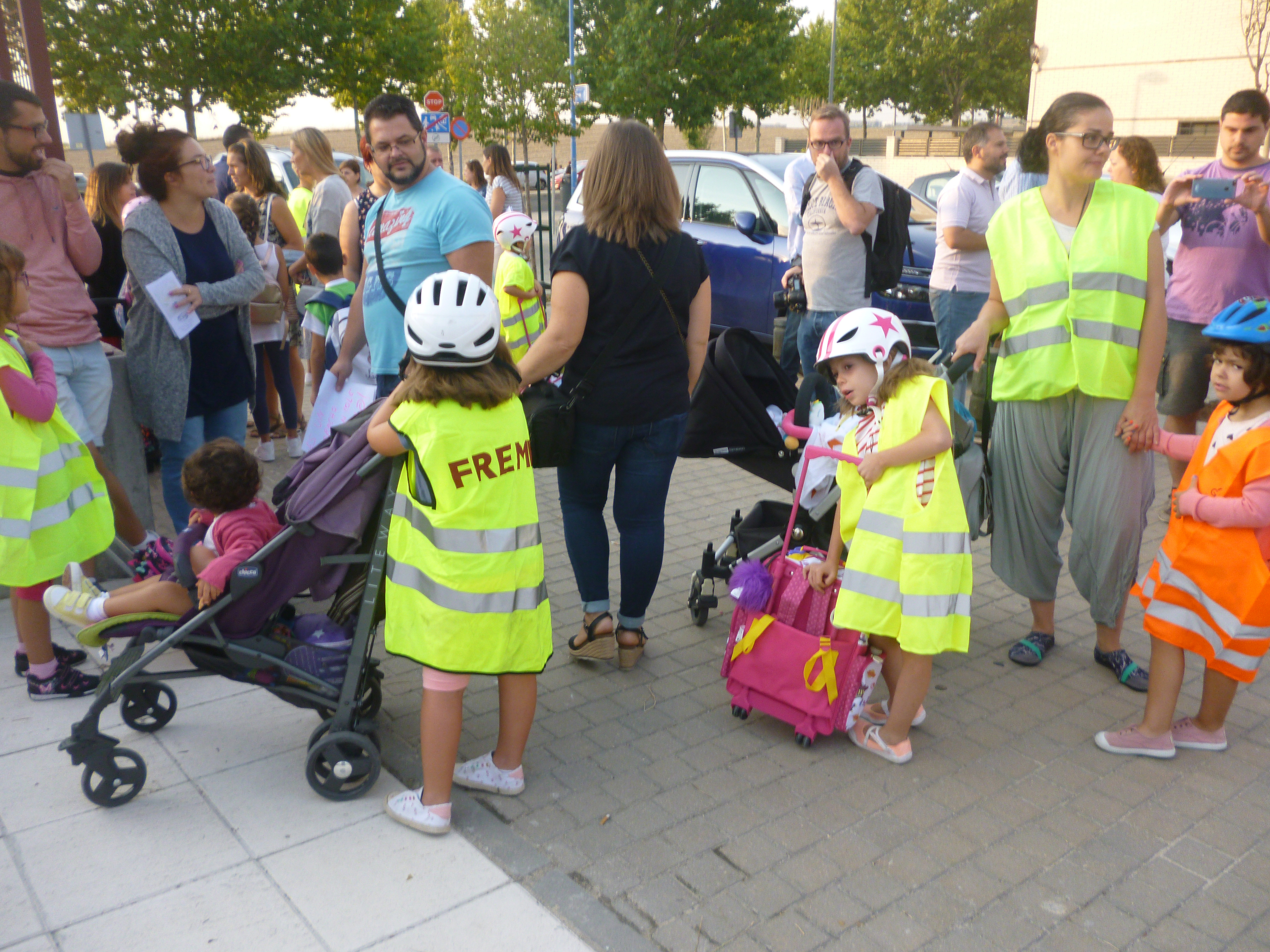 Debido a que no han finalizado las obras de un nuevo edificio que albergará las clases de Primaria, las madres y padres del colegio Constitución 1812 del barrio de Vereda de los Estudiantes de Leganés han llevado a sus hijos a las aulas el primer día de clase ataviados con cascos y chalecos reflectantes.