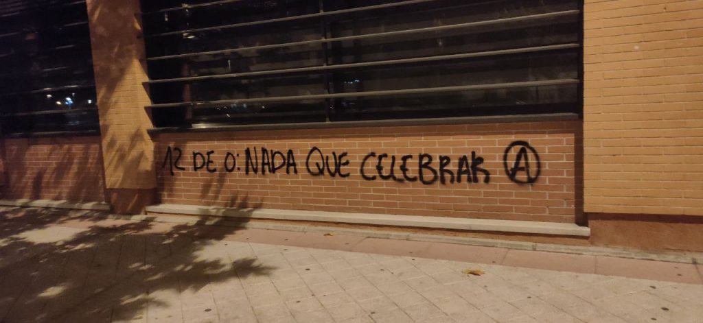 Con el símbolo anarquista y lemas como: «Muerte al colonialismo», o «12 de octubre, nada que celebrar», los radicales han ensuciado varios espacios públicos que tendrán que ser eliminados por los servicios de limpieza municipales, lo que conlleva un gasto a todos los fuenlabreños.