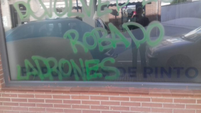 El pasado sábado, 26 de mayo, la sede del PP de Pinto ubicada en la calle del Marqués número 8 fue víctima de un nuevo ataque a raíz de la sentencia del caso Gurtel un día anterior. Así lo denunciaba el propio Partido Popular pinteño en sus redes sociales donde mostraba la cristalera de la sede con pintadas de: «devolved lo robado, ladrones».