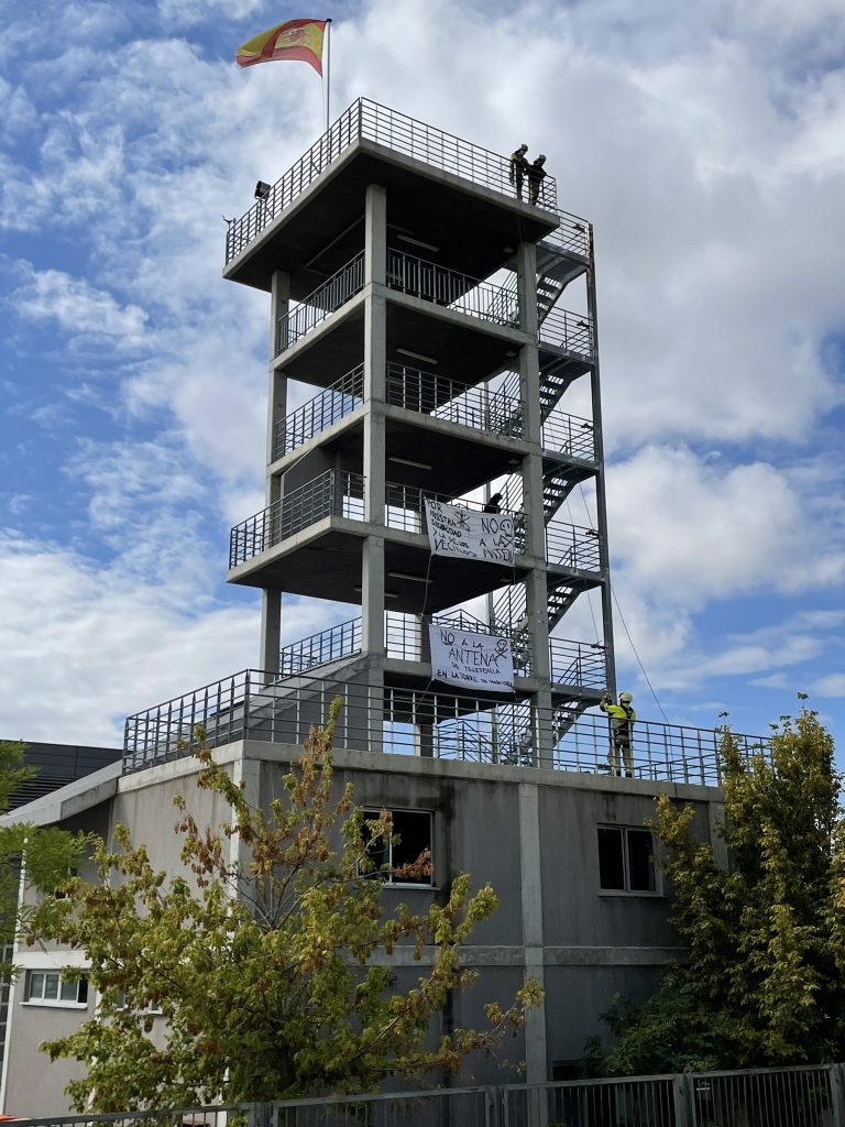 Pero estos se han revuelto. Como es lógico, no querían que les chafaran la manguera de una forma tan torticera. Así lo hacían saber a la ciudadanía, colocando pancartas de rechazo en la torre del Parque que usan para sus maniobras.