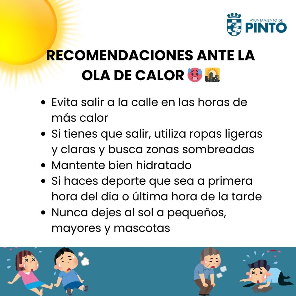 El Ayuntamiento de Pinto ha lanzado una serie de recomendaciones ante la llegada de la primera ola de calor del verano y después de que la Comunidad de Madrid haya activado el nivel 2 de alerta por altas temperaturas, que este fin de semana rondarán los 40 grados.