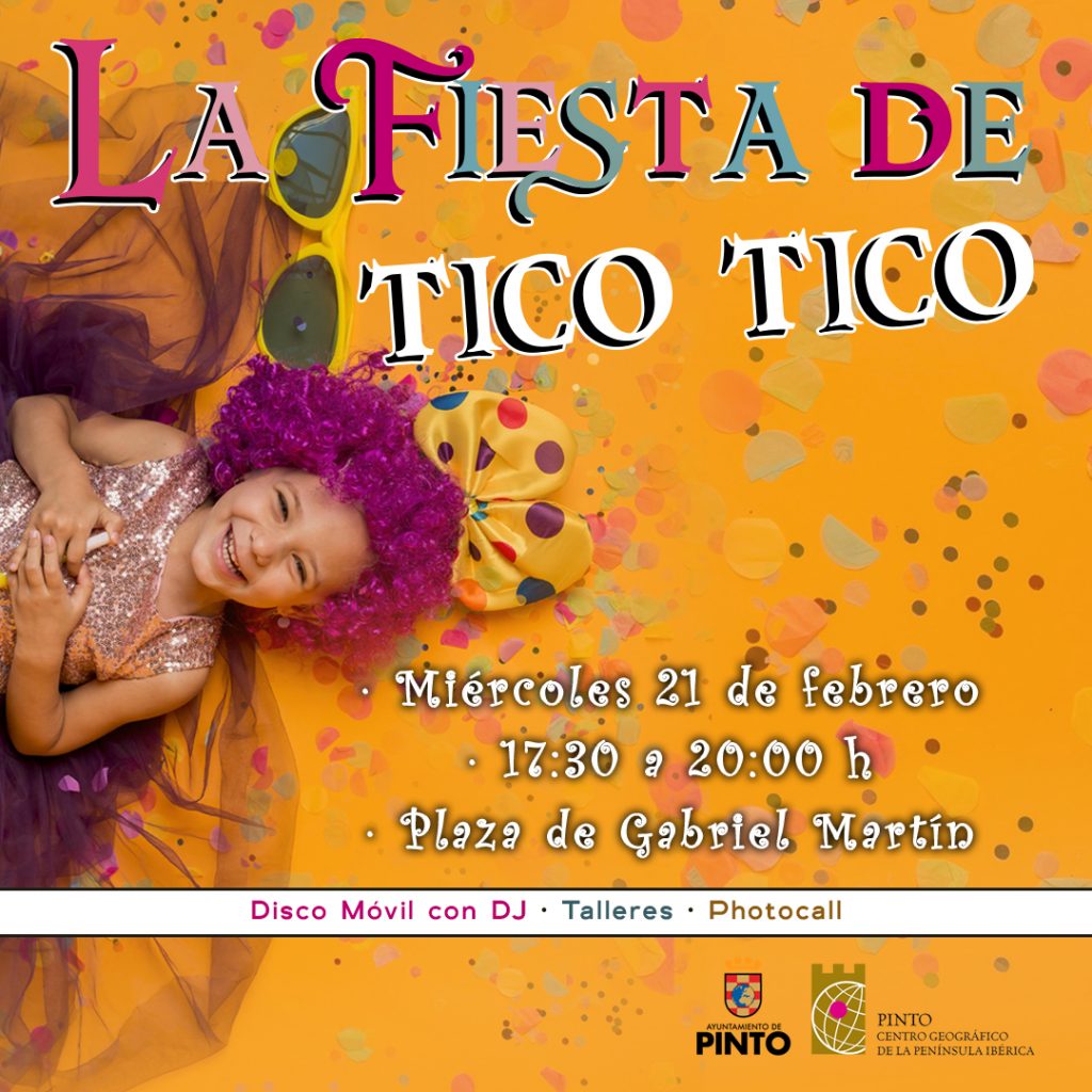 La Concejalía de Educación del Ayuntamiento de Pinto ha organizado una fiesta especial para los más pequeños con la que poner el broche de oro a las fiestas de Carnaval. Se trata de la ‘La Fiesta de Tico Tico’, que tendrá lugar el próximo 21 de febrero en la Plaza de Gabriel Martín, entre las 17.30 y las 20:00 horas.