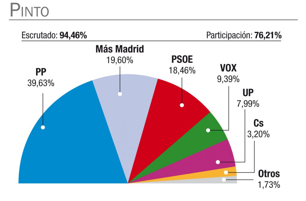 Pinto no ha sido una excepción a la tónica general de estas elecciones autonómicas y se ha decantado de manera abrumadora por la opción de Ayuso. Así, el PP ha pasado del 17,2% de los votos (4.329) cosechado en 2019 al 39,6% (10.613) de 2021. Una espectacular mejoría que casi triplica los resultados obtenidos hace apenas dos años.