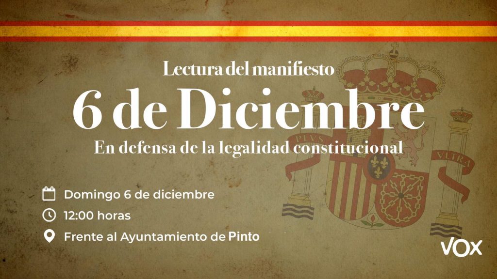 Este domingo, 6 de diciembre, se celebra la aprobación unánime de la Constitución por parte del pueblo español. Y con motivo de esta efeméride, el grupo municipal de VOX en Pinto ha llamado a los vecinos a manifestarse frente al Ayuntamiento, a partir de las 12.00 horas, «en defensa de la legalidad constitucional».