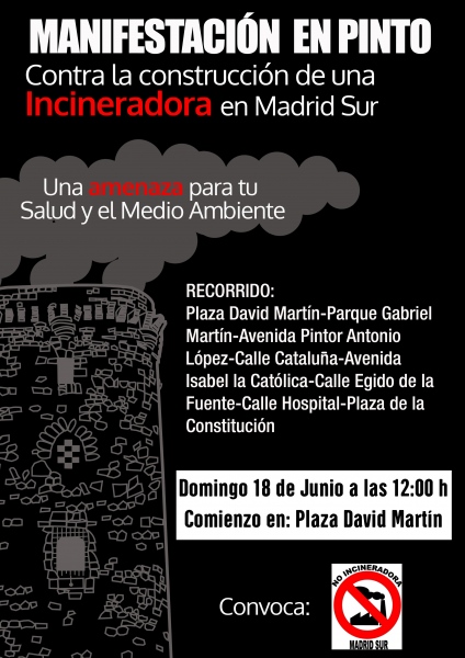 De esta manera, en Pinto, la manifestación saldrá a las 12.00 horas desde la Plaza de David Martín, y transcurrirá por las calles del municipio hasta acabar frente el Ayuntamiento. En ella marcharán los más de 70 colectivos que conforman la Plataforma contra la inicineradora de residuos y que ya ha recogido 14.000 firmas en change.org en este sentido.