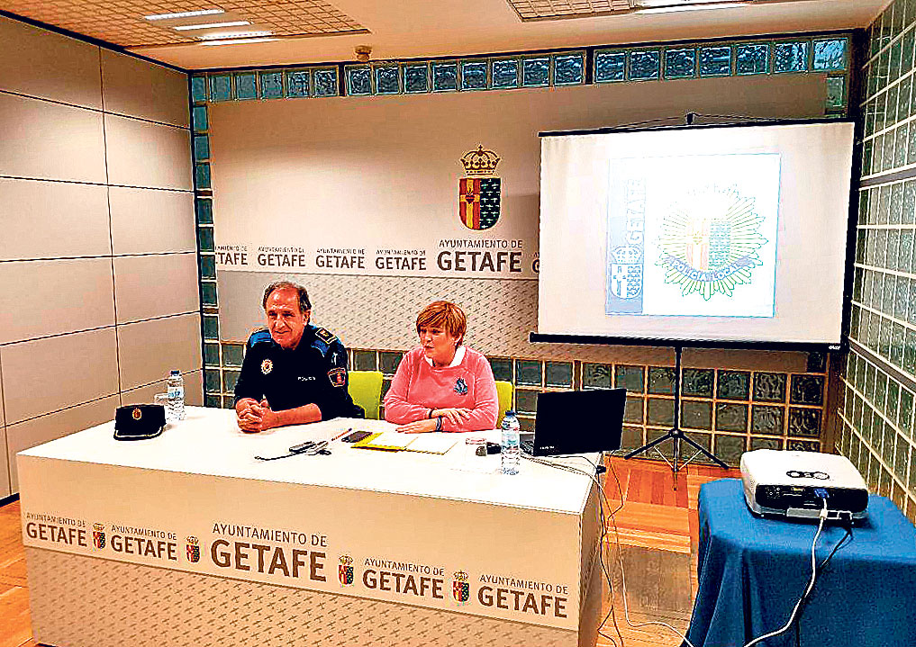 La concejala de Seguridad Ciudadana del Ayuntamiento, Raquel Alcázar, y el Jefe de la Policía Local, Pedro Cervel, presentaron este miércoles la nueva cuenta oficial de Twitter del cuerpo municipal: @policiadegetafe.
