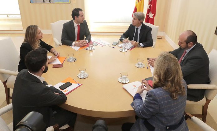 El presidente de la Comunidad de Madrid, Ángel Garrido, y el portavoz de Ciudadanos en la Asamblea de Madrid, Ignacio Aguado, han firmado este lunes el acuerdo que permitirá sacar adelante los Presupuestos de 2019, los más altos de la historia de la región con 20.072 millones de euros y que incluyen una nueva rebaja fiscal consensuada entre ambos.