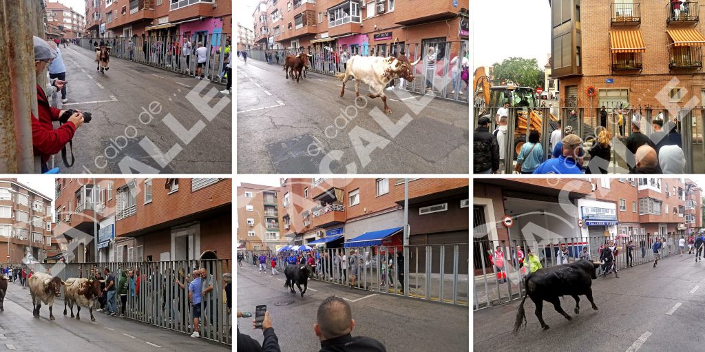 Una grúa se lleva a un toro en el primer encierro de las Fiestas de Fuenlabrada tras más de dos horas de duración