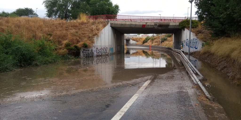 La carretera tuvo que ser cortada en la mañana de este martes por acumulación de agua. Se mantiene la alerta naranja por tormentas en toda la Comunidad de Madrid hasta las 23.00 horas de hoy.
