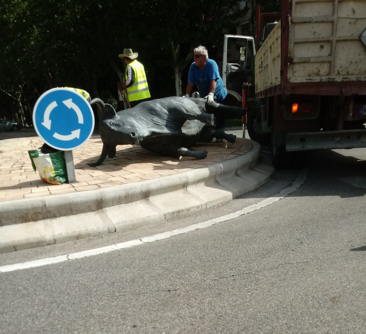 Sorprendidos se han quedado los vecinos del popular barrio de Getafe, La Alhóndiga, cuando se han dado cuenta este martes de que dos operarios estaban trabajando en la estatua de un toro situada en una de las rotondas de acceso desde la carretera de Toledo a la ciudad y que a primera hora de la mañana se encontraba caída.