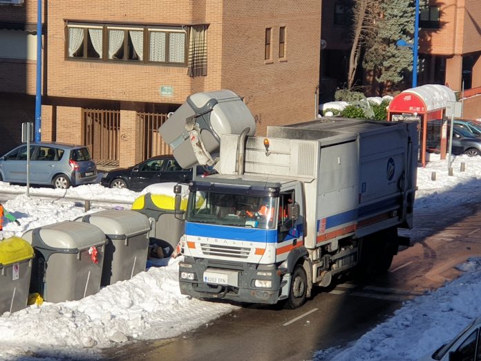 La retirada de residuos sólidos urbanos ha comenzado en la mañana de este miércoles, como recoge la instantánea tomada por el periodista de Leganés, Chema Lázaro.