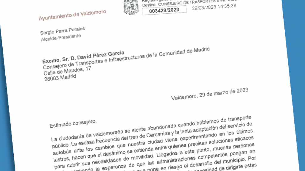 El alcalde de Valdemoro, Sergio Parra, ha remitido una carta al consejero de Transportes e Infraestructuras de la Comunidad de Madrid, David Pérez, en la que le propone el desarrollo de una línea de metro ligero en superficie que conecte Getafe con Valdemoro y continúe desde la estación de Cercanías al Hospital Infanta Elena para dar servicio a los nuevos barrios del municipio.