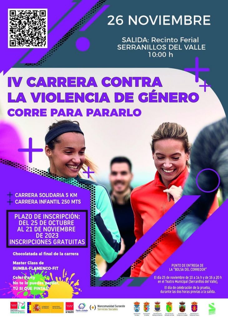 La cuarta edición de la Carrera Popular contra la Violencia de Género llega a Serranillos del Valle el domingo 26 de noviembre, coincidiendo prácticamente en el tiempo con el Día Internacional para la eliminación de la Violencia contra las Mujeres que se celebra el día anterior y que se pretende reivindicar a través de esta carrera solidaria.