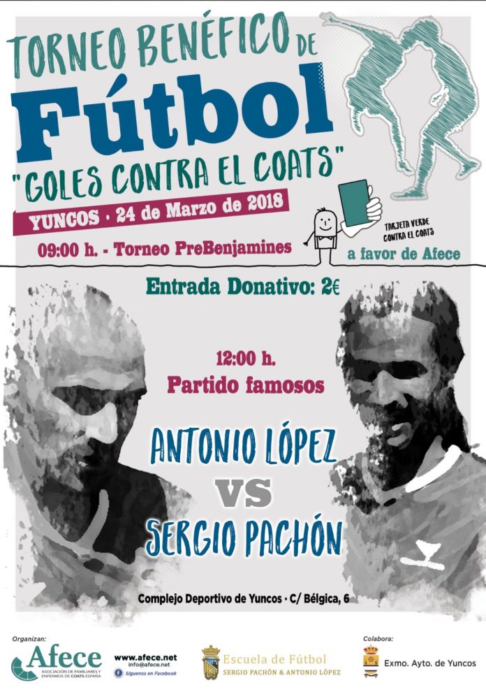 Este sábado día 24, a partir de las 9.00 horas, tendrá lugar en el complejo deportivo de Yuncos un Torneo de fútbol benéfico que lleva por nombre ‘Goles contra el Coats’. Primero habrá un torneo de fútbol de categoría prebenjamín y posteriormente un partido entre famosos y exfutbolistas apadrinado por Antonio López y Sergio Pachón.
