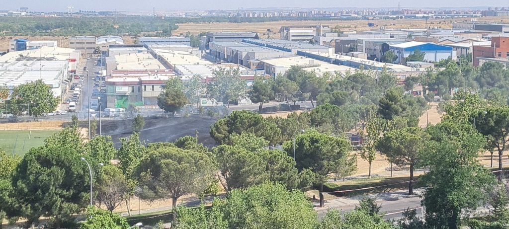 Los Bomberos de Alcorcón sofocaron este domingo, 17 de julio, un importante incendio de pastos originado en una zona de matorrales, en la calle Institutos, próxima al complejo deportivo Vicente del Bosque, en el polígono Urtinsa.