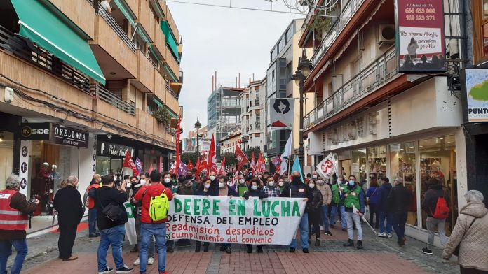 Trabajadores de la factoría de John Deere en Getafe, una de las más importantes de España, han salido este jueves a las calles de Getafe, para pedir la readmisión de los once despedidos por la compañía, y que ésta cumpla con el convenio colectivo.