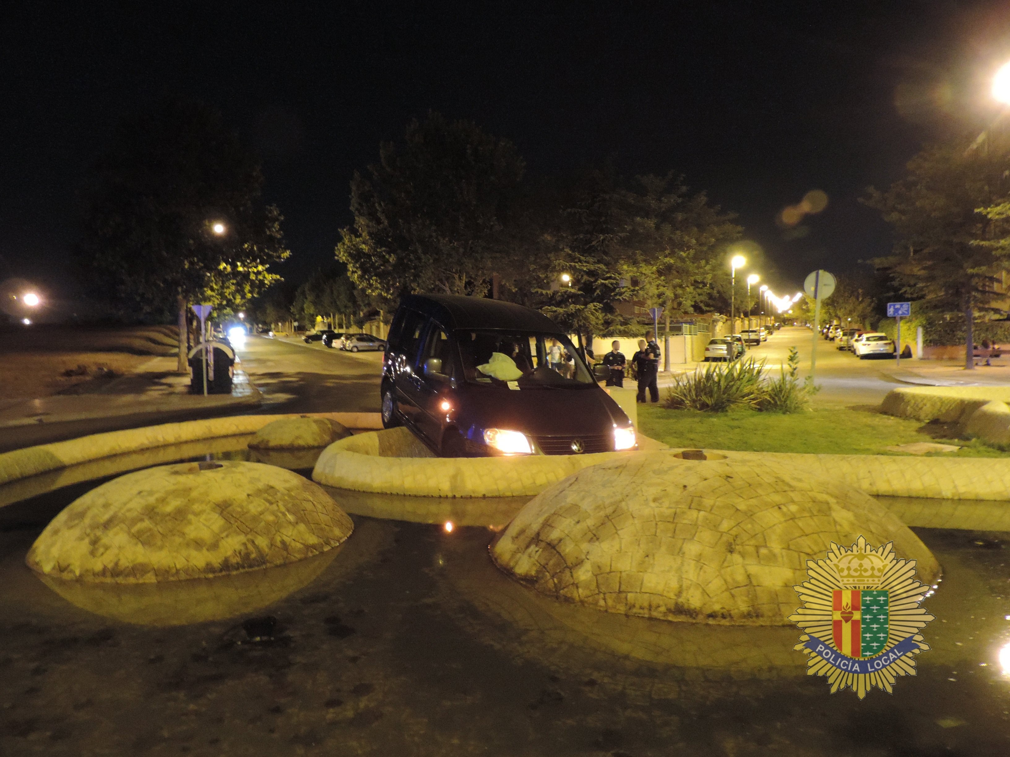 El conductor al llegar a la rotonda no hizo el giro y siguió de frente, por lo que el coche acabó dentro de la fuente, que en ese momento no funcionaba aunque había algo de agua.