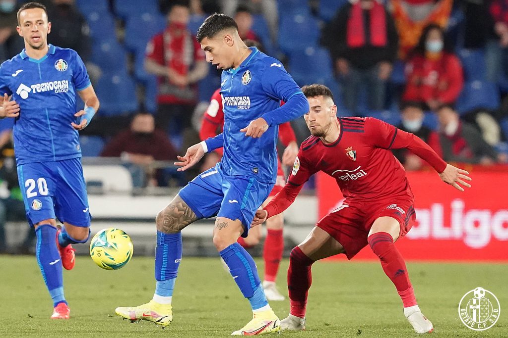 Corría el minuto 93′ -restaba apenas uno para la conclusión del encuentro- cuando Damián Suárez ha colgado un balón al área en lo que era el último cartucho del conjunto azulón para superar a Osasuna, tan incómodo y bien pertrechado como siempre que siempre que actúa a domicilio. El pulso dentro del área estaba servido a sabiendas de que el duelo se consumía y desde atrás ha aparecido la cabeza de Darío Poveda, que había saltado hacía menos de diez minutos, para colocar el balón lejos del alcance de Sergio Herrera y rubricar un triunfo de incalculable valor para el Geta.